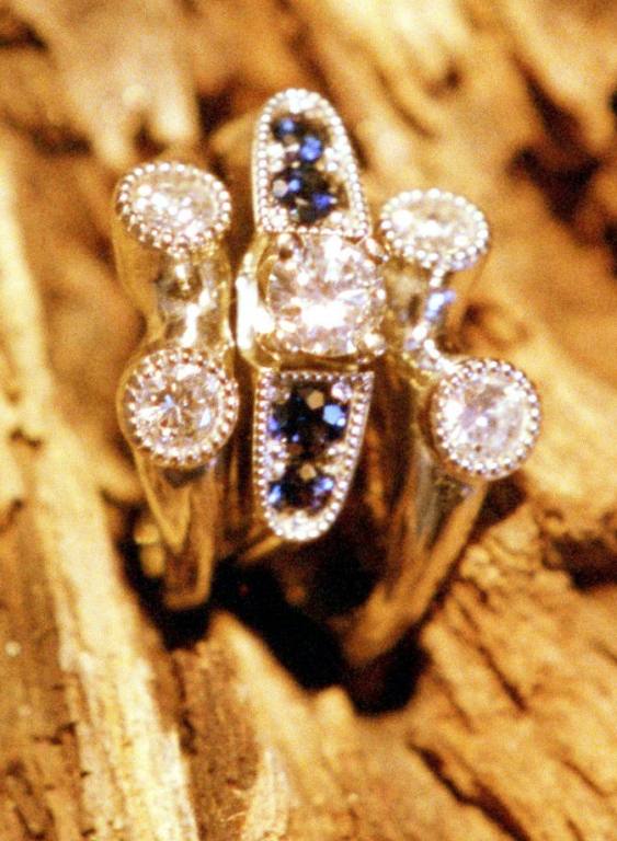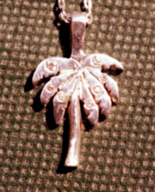 | Our customer wanted an Engagement Ring that would be TOTALLY different....so we "Haloed" a 1.25c Raw Diamond with 12 Round Brilliant Diamonds just for her. A "Halo" Ring unlike any others! | | An Engagement Ring containing a single Dark Sapphire set in 14K White Gold using a modified Channel. Simplicity and clean lines like the client desired. (The dark areas on each side are only shodows.) | | A Client's request: a Palm Tree Pendent set with Diamonds in 14K White Gold... a fun piece for his favorite lady who loved everything "Palm-ey". |