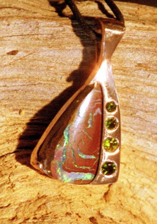 | | Here is the finished Engagement Ring and Wedding Guard Set in Sapphire and White Gold as originally Computer-rendered on the left. The Rings are set slightly askew in the picture to better show them individually, but they are worn as the rendering shows. | | Here is a Koroite Opal Pendent (also known as Ironstone Opal) in 14K Yellow Gold with emerald green Chrome Diopside accents. |